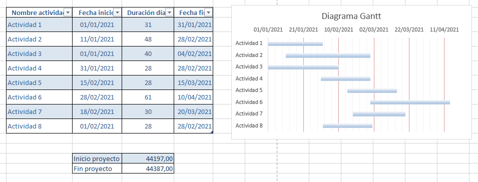 Este sería el formato de un diagrama de Gantt, de forma muy sencilla, para poder entender su funcionamiento.