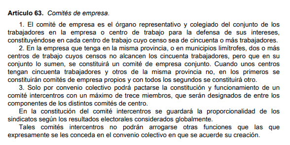Para el caso de aquellas empresas o centros de trabajo que cuenten con 50 trabajadores o más, la representación de estos se llevará a cabo mediante comité de empresa, regulado en los artículos 63 y 66 del Estatuto de los trabajadores.